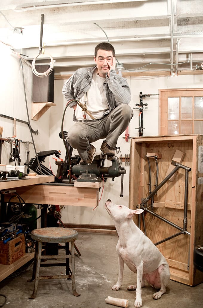 Ezra’s father is a woodworker, but Ezra was an artist, and the fenders were beautiful: bent, laminated, lushly stained. They blew up, but “I decided that I wanted to be doing the whole thing. I went down to Austin, Texas, to take some brazing lessons with friend and builder, Whit Moyer. Spent about ten days with him and then came back to the city and spent every penny I had on getting set up.” In 2007, Fast Boy Cycles was born.